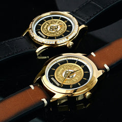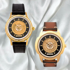 The One Pice Coin Watch, bears the King George VI One Pice Coin (The Lowest Denomination of British India Coinage) in the center. A Carbon Fibre Dial with Hindi Numeral Markings and Metal Indicators surrounds the coin. The timepieces feature a genuine leather strap along with a gold finish case. The female watch case is embedded with original Swarovski Crystal making for a sophisticated heirloom.