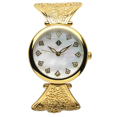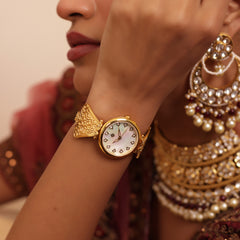 Inspired by the half-cuff jewelry once worn by the queens of India, the Golden Embrace watch is a symbol of love and elegance. The watch features intricate engravings on both cuffs, showcasing fine craftsmanship, and is complemented by a captivating Mother of Pearl dial. Blending royal heritage with timeless beauty, Golden Embrace embodies a graceful tribute to romance and tradition.