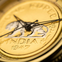 This 43mm stainless steel watch has been created by using a particular One Rupee Coin from the year 1947, bearing a Tiger on the face. The Walking tiger (Baagh in Hindi) has close resemblance with the Make In India Logo. This One Rupee Coin holds its significance as it was the last coin minted under the British Rule. It was minted only in the years 1946 (second half) and 1947.