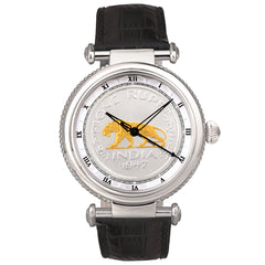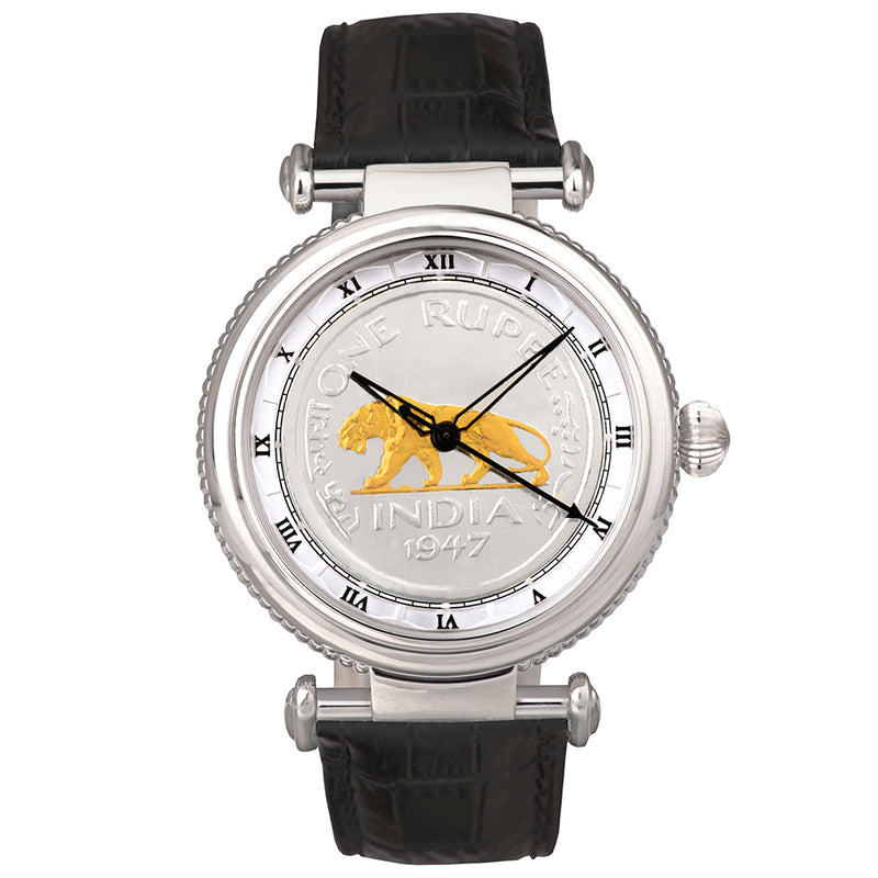 This 43mm stainless steel watch has been created by using a particular One Rupee Coin from the year 1947, bearing a Tiger on the face. The Walking tiger (Baagh in Hindi) has close resemblance with the Make In India Logo. This One Rupee Coin holds its significance as it was the last coin minted under the British Rule. It was minted only in the years 1946 (second half) and 1947.