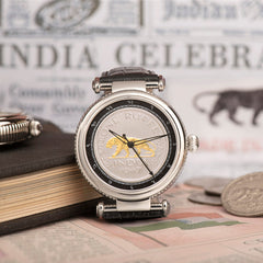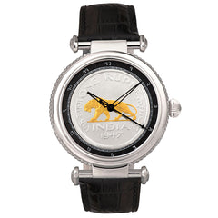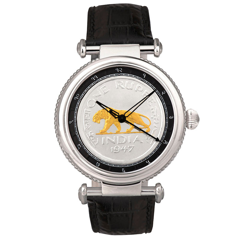 This 43mm stainless steel watch has been created by using a particular One Rupee Coin from the year 1947, bearing a Tiger on the face. The Walking tiger (Baagh in Hindi) has close resemblance with the Make In India Logo. This One Rupee Coin holds its significance as it was the last coin minted under the British Rule. It was minted only in the years 1946 (second half) and 1947.