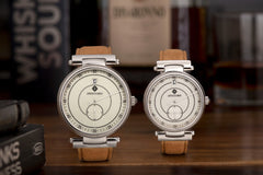 This heirloom has an enamelled off-white dial, with the hour window placed right at the top. It has one long hand that sweeps the dial indicating the minutes and a sub dial displaying a tiny second hand. This mechanism is based on a modified automatic movement, with a power reserve of 42 hours. Part of the complexity of creating a jump hour movement is the regulation of power that is transferred to the hour disc. This elegant timepiece with a steel case, chrome finish, special lugs and a 'quick-release' strap is available in a Jaipur Watch Company Signature Case with a unique embossed back.