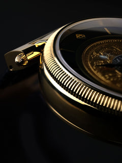 The vintage coin is placed inside a specially created color dial with raised metal indices. Completely donned in sapphire (domed sapphire in front and sapphire glass behind), this 42 mm size watch ticks on an Automatic Movement from Miyota Citizen. The Bezel of the watch resembles the traditional Indian design.