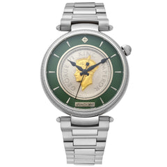 The vintage coin is placed inside a specially created color dial with raised metal indices. Completely donned in sapphire (domed sapphire in front and sapphire glass behind), this 42 mm size watch ticks on an 8215 Automatic Movement from Miyota Citizen. The Bezel of the watch resembles the traditional Indian design.