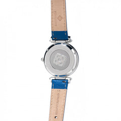 This royal blue heirloom has an enameled blue dial, with the hour window placed right at the top. It has one long hand that sweeps the dial indicating the minutes and a sub dial displaying a tiny second hand. This mechanism is based on a modified automatic movement, with a power reserve of 42 hours. Part of the complexity of creating a jump hour movement is the regulation of power that is transferred to the hour disc. This elegant timepiece with a steel case, chrome finish, special lugs and a 'quick-release' strap is available in a Jaipur Watch Company Signature Case with a unique embossed back.