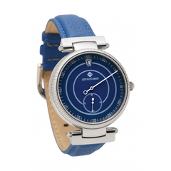 This royal blue heirloom has an enamelled blue dial, with the hour window placed right at the top. It has one long hand that sweeps the dial indicating the minutes and a sub dial displaying a tiny second hand. This mechanism is based on a modified automatic movement, with a power reserve of 42 hours. Part of the complexity of creating a jump hour movement is the regulation of power that is transferred to the hour disc. This elegant timepiece with a steel case, chrome finish, special lugs and a 'quick-release' strap is available in a Jaipur Watch Company Signature Case with a unique embossed back.