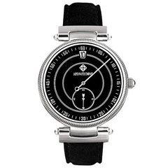 This royal black heirloom has an enamelled black dial, with the hour window placed right at the top. It has one long hand that sweeps the dial indicating the minutes and a sub dial displaying a tiny second hand. This mechanism is based on a modified automatic movement, with a power reserve of 42 hours. Part of the complexity of creating a jump hour movement is the regulation of power that is transferred to the hour disc. This elegant timepiece with a steel case, chrome finish, special lugs and a 'quick-release' strap is available in a Jaipur Watch Company Signature Case with a unique embossed back.