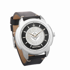 The One Pice Coin Watch, having the King George VI One Paisa Coin (The Lowest Denomination of British India Coinage) in center, limited to 100 units. The coin rests on a Carbon Fibre Dial with Hindi Numeral Markings and metal indices around it. Available in Black Strap with Steel Finish Case and Brown Strap with Gold Polished Case.
