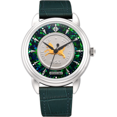 The watch face is adorned with a never used before Opal stone and Aventurine Stone Dial and Black mother-of-pearl dial, adding an element of elegance and sophistication. The luminous quality of the mother-of-pearl complements the vintage charm of the One Pice coin, creating a harmonious blend of history and artistry. The sleek, silver-tone case and black leather strap enhance its timeless appeal, making it a versatile accessory for any occasion.