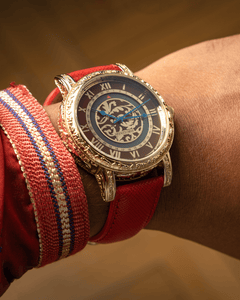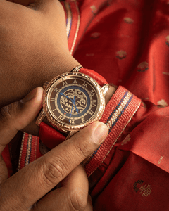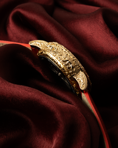 In every great civilization, the tiger (the Baagh) has stood as a guardian of the wild and a sovereign of the land. The Royal Baagh Collection channels this enduring symbol of strength into a timepiece that is as commanding as it is refined—built for those who carry a sense of purpose, presence, and pride. This collection is a tribute to legacy—an homage to the iconic Baagh timepiece that has become one of our most celebrated creations. Royal Baagh evolves that spirit, pushing the boundaries of craftsmanship and detail while honoring the soul of the original. Each case is CNC-carved individually, sculpted with singular focus to ensure every edge, curve, and engraving receives the care it deserves. The case and lugs are enveloped in exquisite macro 3D reliefs—a prowling Baagh brought to life, surrounded by intricate floral motifs inspired by India’s royal courts and classical design. At the center of the watch, a traditional floral dial pattern blooms with elegance. Subtle innovation adds movement: a rotating date disc, tracked by a sharp red triangle, encircles the dial—merging storytelling with function. Shielded by sapphire crystal, the Royal Baagh is built to endure—just like the legacy it celebrates.