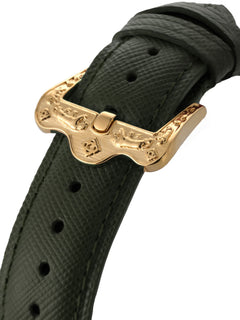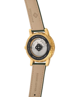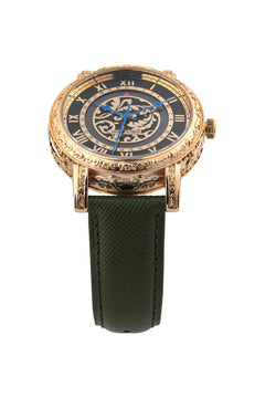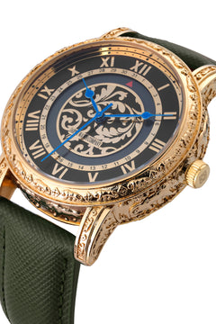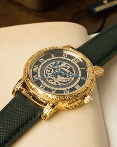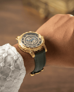 In every great civilization, the tiger (the Baagh) has stood as a guardian of the wild and a sovereign of the land. The Royal Baagh Collection channels this enduring symbol of strength into a timepiece that is as commanding as it is refined—built for those who carry a sense of purpose, presence, and pride. This collection is a tribute to legacy—an homage to the iconic Baagh timepiece that has become one of our most celebrated creations. Royal Baagh evolves that spirit, pushing the boundaries of craftsmanship and detail while honoring the soul of the original. Each case is CNC-carved individually, sculpted with singular focus to ensure every edge, curve, and engraving receives the care it deserves. The case and lugs are enveloped in exquisite macro 3D reliefs—a prowling Baagh brought to life, surrounded by intricate floral motifs inspired by India’s royal courts and classical design. At the center of the watch, a traditional floral dial pattern blooms with elegance. Subtle innovation adds movement: a rotating date disc, tracked by a sharp red triangle, encircles the dial—merging storytelling with function. Shielded by sapphire crystal, the Royal Baagh is built to endure—just like the legacy it celebrates.