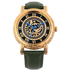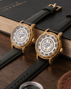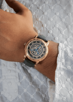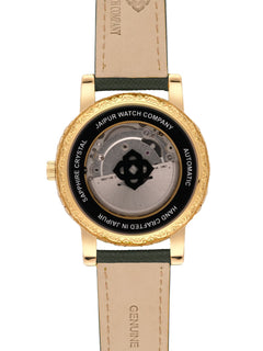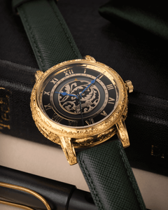 In every great civilization, the tiger (the Baagh) has stood as a guardian of the wild and a sovereign of the land. The Royal Baagh Collection channels this enduring symbol of strength into a timepiece that is as commanding as it is refined—built for those who carry a sense of purpose, presence, and pride. This collection is a tribute to legacy—an homage to the iconic Baagh timepiece that has become one of our most celebrated creations. Royal Baagh evolves that spirit, pushing the boundaries of craftsmanship and detail while honoring the soul of the original. Each case is CNC-carved individually, sculpted with singular focus to ensure every edge, curve, and engraving receives the care it deserves. The case and lugs are enveloped in exquisite macro 3D reliefs—a prowling Baagh brought to life, surrounded by intricate floral motifs inspired by India’s royal courts and classical design. At the center of the watch, a traditional floral dial pattern blooms with elegance. Subtle innovation adds movement: a rotating date disc, tracked by a sharp red triangle, encircles the dial—merging storytelling with function. Shielded by sapphire crystal, the Royal Baagh is built to endure—just like the legacy it celebrates.
